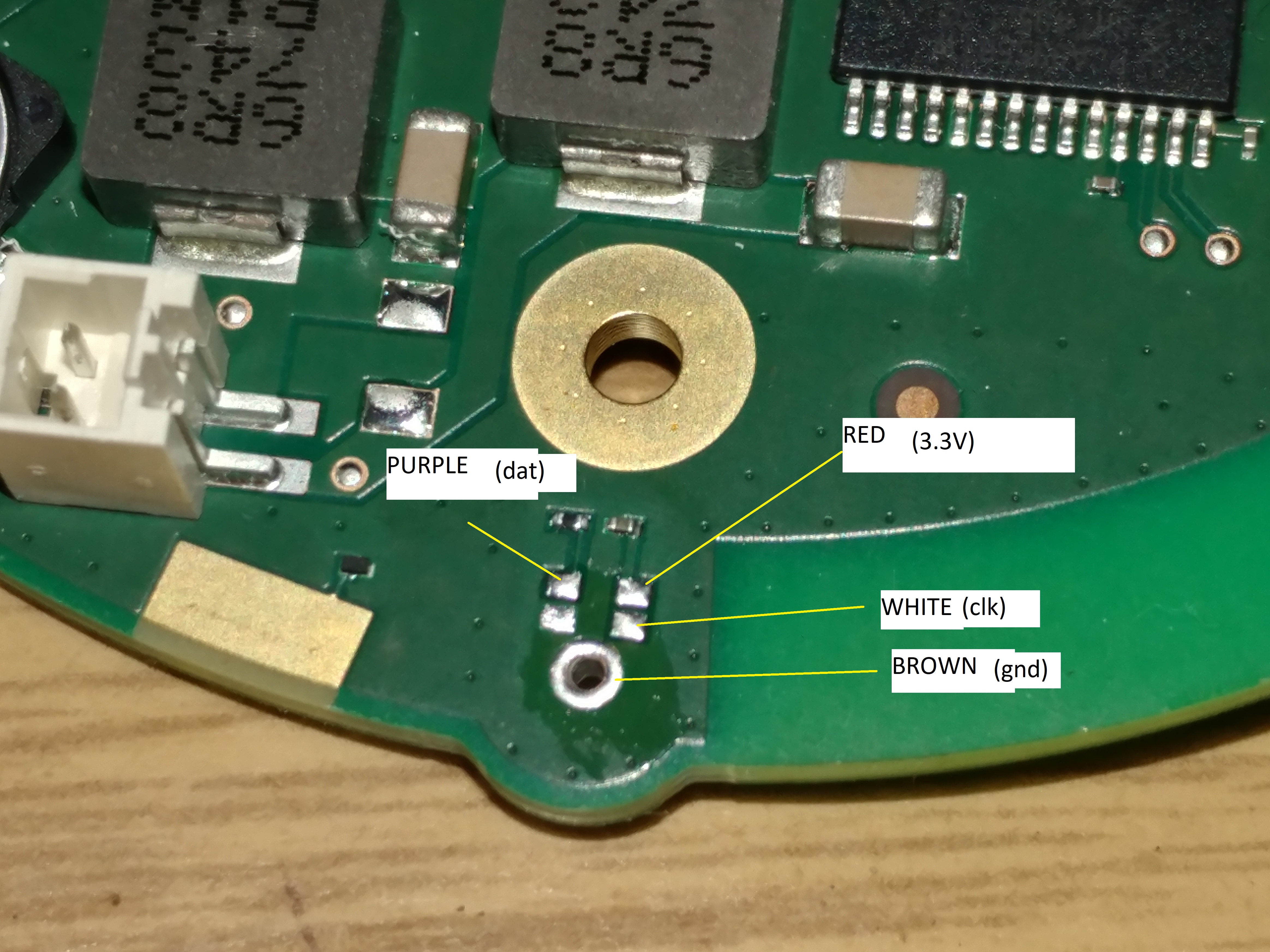 Solder the wires to the pads as shown, careful not to have any shorts. It doesn’t matter which