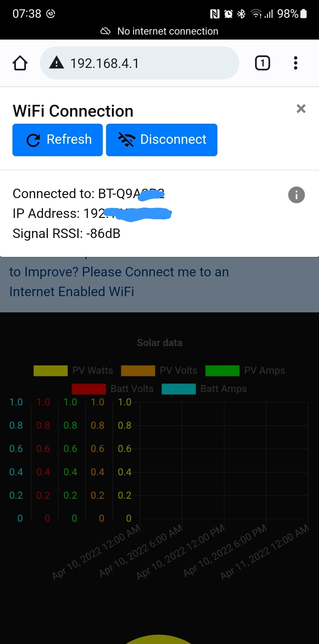 Thanks for the reply so just to make sure I'm understanding when you say connect locally I connected the box to my WiFi in the house as my WiFi reaches the van then I went onto my phone and opened http://192.168. Page which loads the device screen then It says connected but then doesn't I've grabbed a pic as might make more sense then as I'm new to this I tried on my galaxy hotspot incase it wasn't seeing full signal from house as a test but still was same so I've defo missed something my end. Will give your reply a go first thing there is light in the morning.