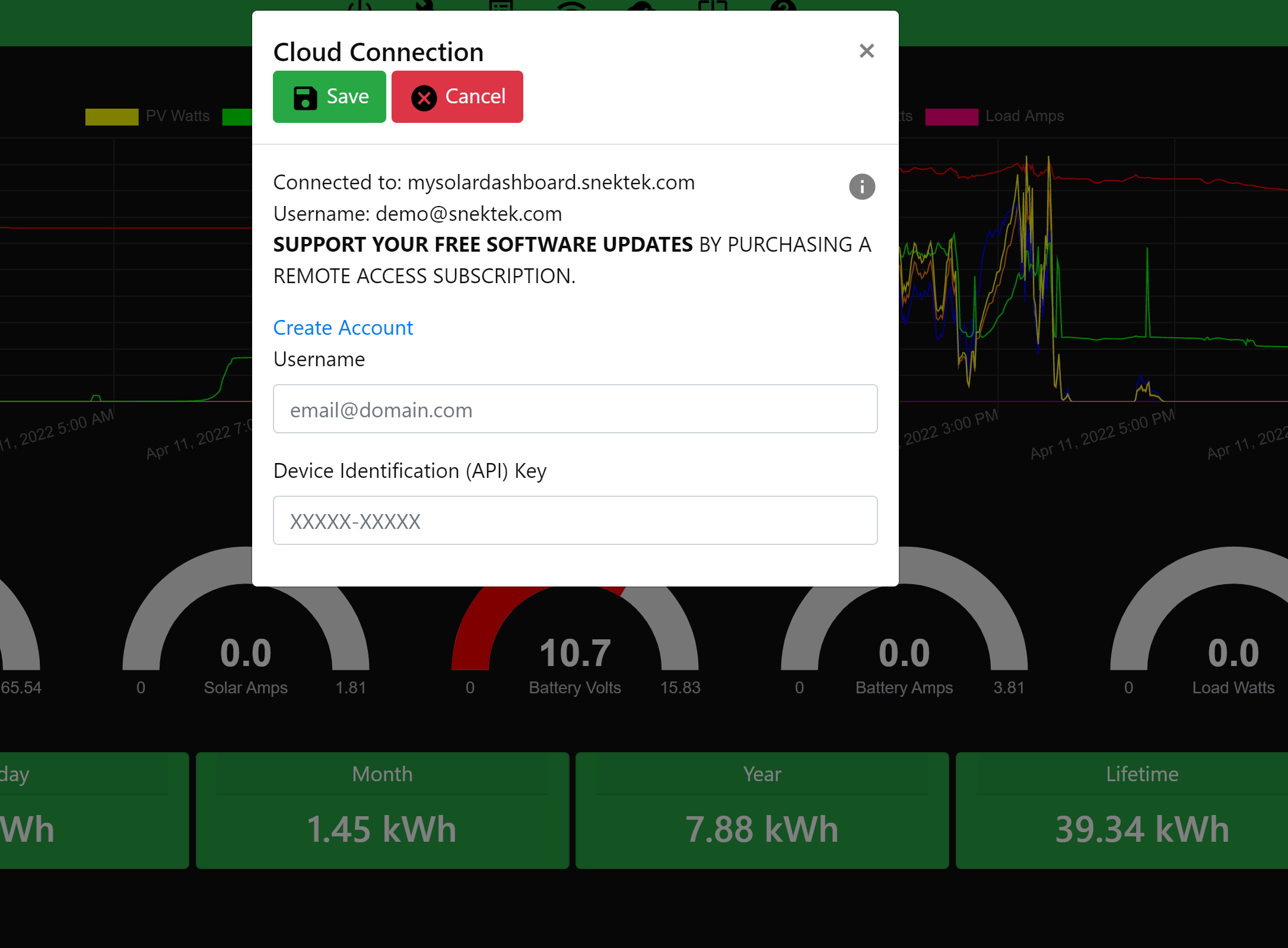 Yea so first of all that signal is low... so it might work or it might not. Also this is why you're seeing the update error message, because the signal is quite low. It's better to have a signal of 75 or lower. But anyway, the next step is to click on the "cloud" icon when connected locally, and copy your username and API key (from the website) into that.