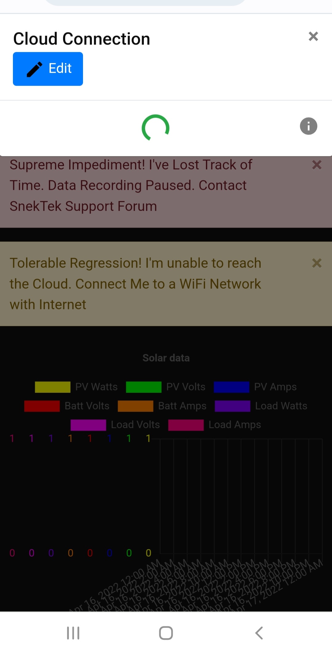 Ok pm me your IP/sdcard/config.txt and logs for today. Most likely it's related to incorrect email/API key so I will check this for you. The timekeeping error tells me you've unplugged the unit recently, probably right before connecting. Refreshing the page or rebooting will clear that.
