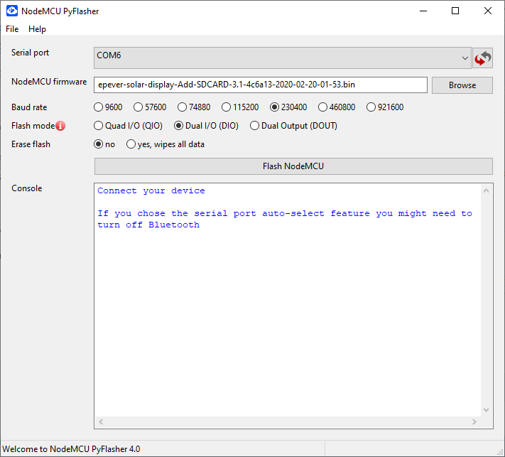 Step 4. Select "Serial port" and click "Browse" to select the .bin file, extracted from Step 1. Set the "Erase flash" option to "yes"