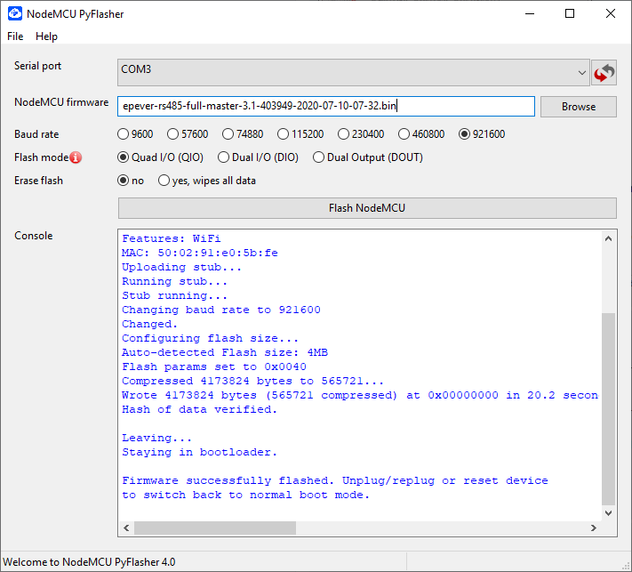 Step 5. Click on "Flash NodeMCU", and see the following output when successfully completed: