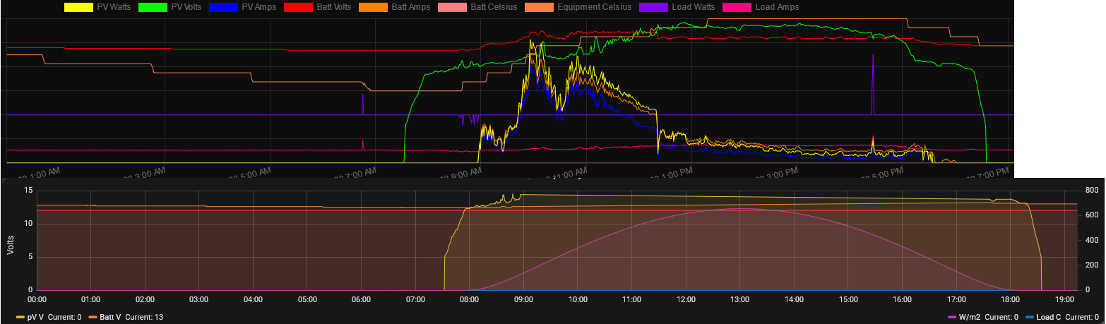 My guess is if there isn't a coding bug that causes a failure based on the clock, it must be caused by the fact that the Sun is just starting to provide enough energy to charge the battery, and at ~14v pV and/or ~13v bV is triggering a bug. That must be why it is failing when the voltages get to that point, and when it automatically resumes when they fall below that point. Attached is the image from Grafana showing the failure/recovery trend. Disregard the horizontal red line as it is my low battery voltage alarm threshold. Also reference the purple line. That is the W/m2 from my weather station and you can see that it seems to support my theory stated above.